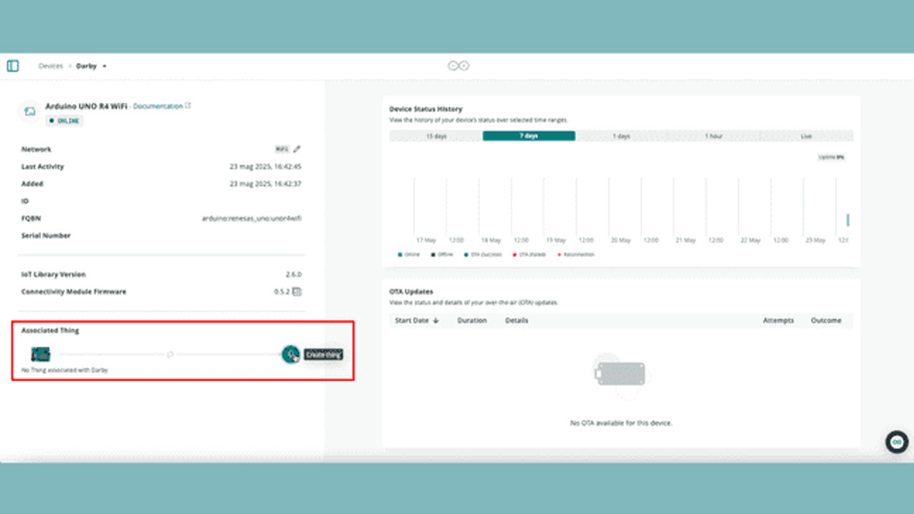 With the board online, you can manage it through Arduino Cloud: