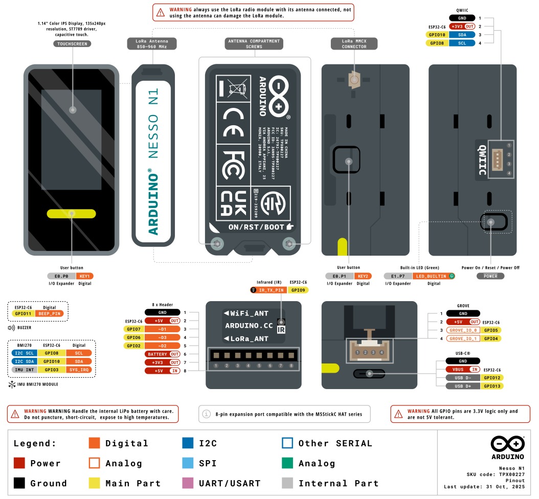 Arduino Nesso N1 The Arduino Nesso N1 IoT development board is based on ESP32-C6 RISC-V 32-bit single-core CPU with a frequency of 160 MHz and efficient and responsive performance on IoT and edge computing projects. It has 16 MB of external Flash, 1536 KB of on-chip Flash, and 512 KB of SRAM which is adequate storage and memory capacity to support data-intensive applications. The board is Wi-Fi 6 (802.11ax), Bluetooth 5.3 LE, and 802.15.4 (Thread/Zigbee) capable of providing high levels of wireless connection to new generation IoT networks. It also incorporates an SX1262 LoRa transceiver in 850-960 MHz with a removable IPEX4 antenna to provide long-range communication.