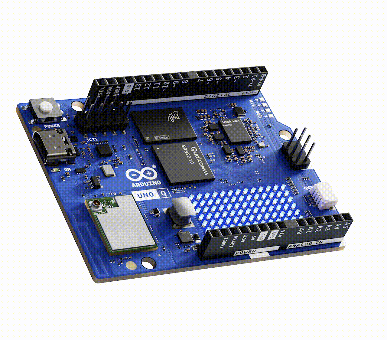 The UNO Q is a system with a Qualcomm Dragonwing QRB2220 MPU (microprocessor) at its core as a high-performance processor and an STM32U585 MCU (microcontroller) as a real-time controller. The Dragonwing chip provides a 2.0 GHz quad-core CPU, Adreno graphics, and image signal processors (ISPs), with AI, vision, and multimedia capabilities. In the meantime, deterministic I/O, timing, as well as control are managed on the STM32 end.