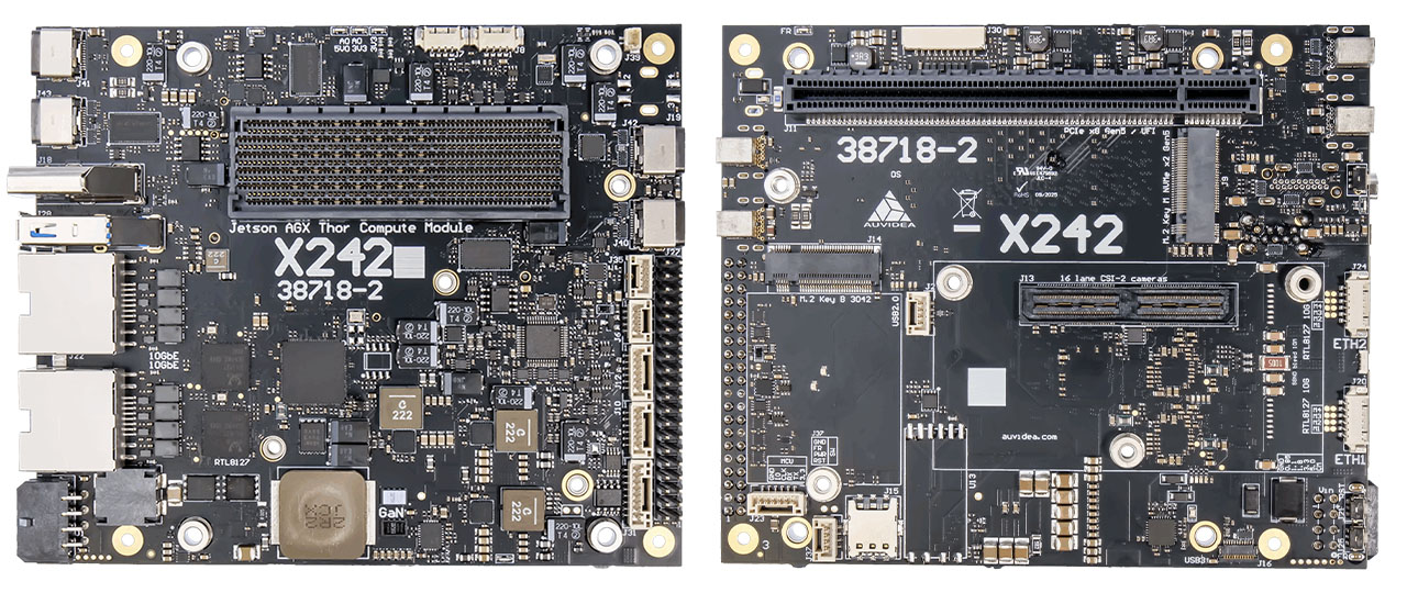 The Auvidea X242 is a premium carrier board designed specifically for the NVIDIA Jetson T5000 (also known as Jetson Thor) system-on-module, delivering a powerful, scalable and flexible platform for advanced robotics, edge AI and embedded computing applications.