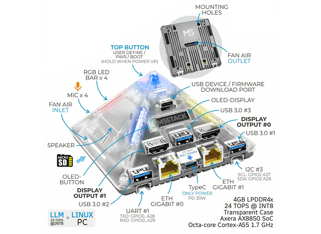 The AI Pyramid Computing Box and the AI Pyramid Computing Box Pro from M5Stack are mini PC with artificial intelligence functionality and powerful hardware that can support local AI processing, edge learning, and support advanced multimedia. Both models have a similar unique pyramid model and core hardware, which makes them the best platform for developers, researchers and integrators of intelligent systems.