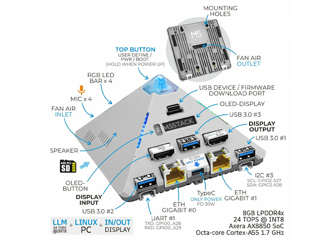 The two variants both rely on the Axera AX8850 SoC, which is an octa-core Cortex-A55 processor solution capable of high-performance neural network inference by a 24 TOPS dedicated NPU. The architecture also allows processing tasks like visual recognition, multimodal interaction, real-time speech processing, and even on-device inference of large language models (LLM), without always being connected to the cloud.
