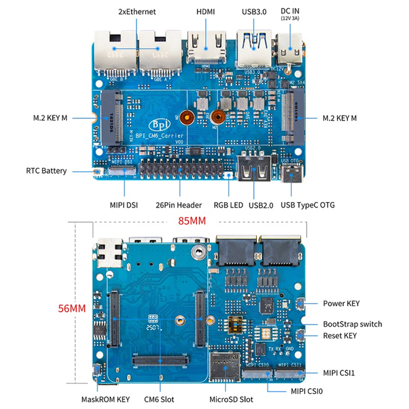 The SpacemiT K1 SoC is “open-architecture” based on the RISC-V instruction set, which makes it attractive for open-source developers and for long-term flexibility. Beyond normal CPU duties, the module integrates imagination IMG BXE-2-32 (running at ~819 MHz) for graphics and general GPU-accelerated tasks. AI accelerator / NPU: the SoC’s architecture claims up to 2.0 TOPS in AI compute power (intended for ML/AI workloads). Due to this, BPI-CM6 is capable of supporting not only general computing but also AI at the edge, machine learning workloads, computer vision (with camera modules in particular) and robotics, in a small-sized energy-efficient module.