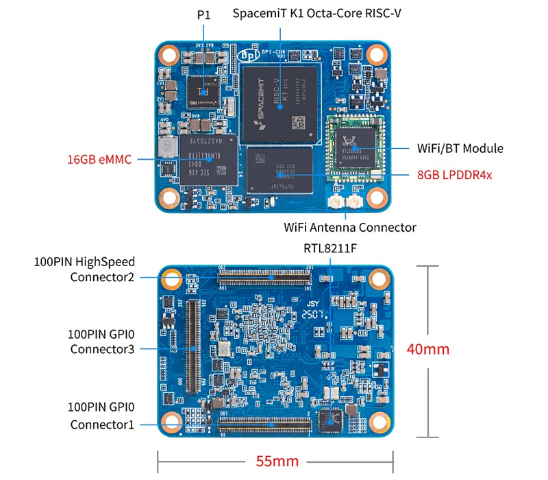 This is nothing like the BPI-SM9, which the company has previously introduced. It has an 8-core SpacemiT K1 RISC-V processor with a frequency around 1.6 GHz and an 8 GB LPDDR4 memory with a 16 GB maximum capacity. It also comes with onboard eMMC storage variations with options of 8GB to 128GB, thus can be customised to lightweight and heavy storage facilities. The carrier board connects it, and it offers a Gigabit Ethernet with a Realtek RTL8211F chipset, WiFi and Bluetooth (on an SDIO board). It has HDMI 1.4 and MIPI-DSI, with camera projects allowed to use up to three MIPI-CSI interfaces.