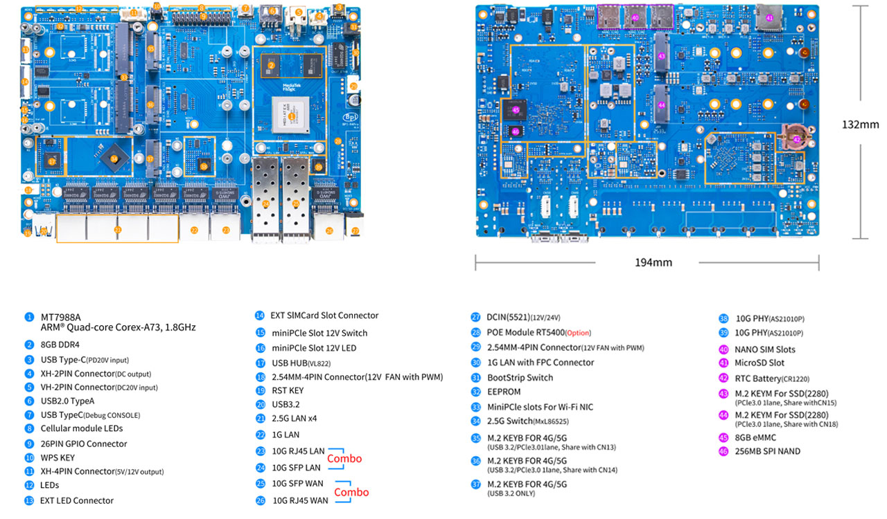 The board offers generous storage and memory; the Pro variant features 8 GB DDR4 memory and onboard 8 GB eMMC plus 256 MB SPI flash (per one spec sheet) for system storage. The most visible one is connectivity; there are 2x 10 GbE SFP+ cages on the board (that may have 10 GbE RJ45 ports), 4x 2.5GbE RJ45 ports and two Gigabit RJ45 ports.