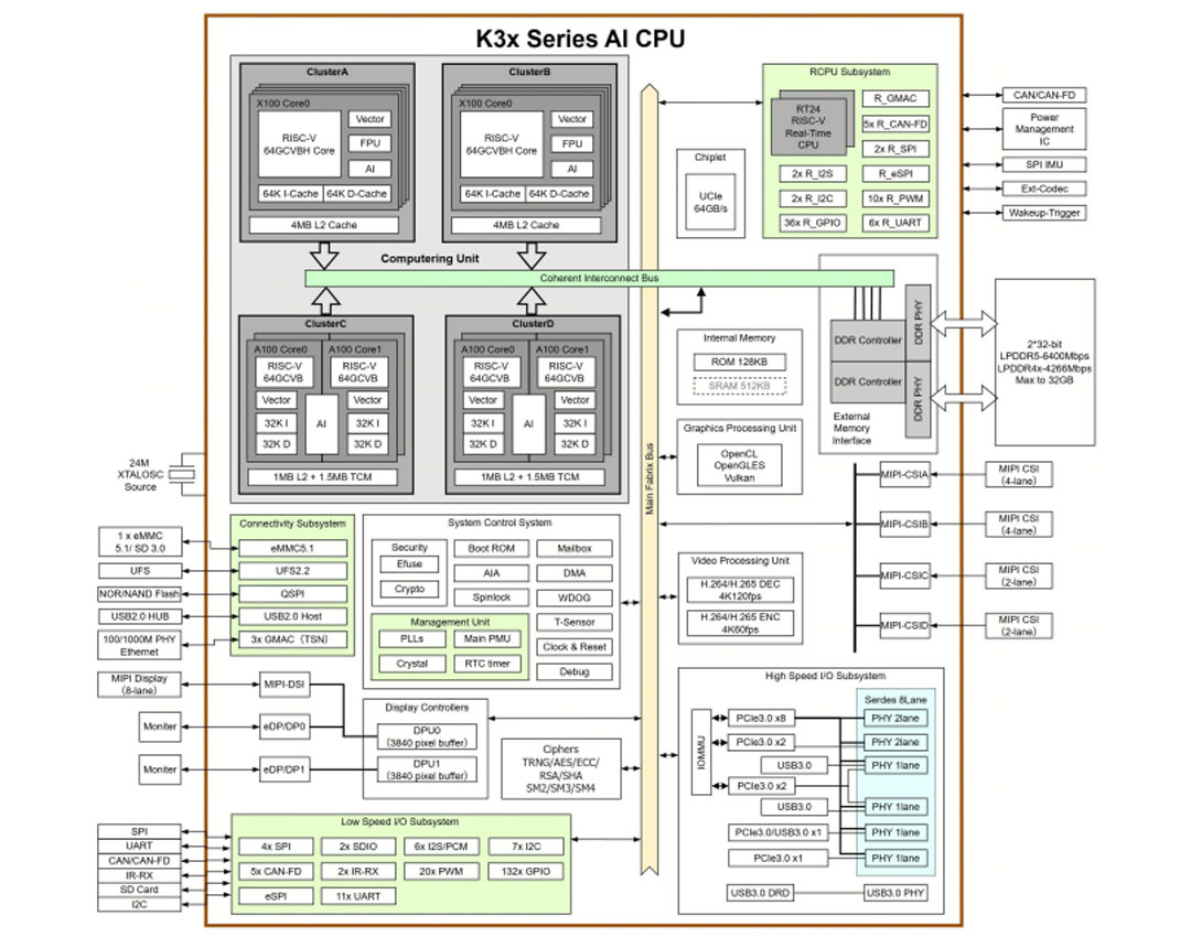 - CPU: 8x X100 64-bit RISC-V cores with 2.4GHz frequency, and based on the RVA23 profile, with a 4-issue out-of-order pipeline and distributed 8MB L2 cache.