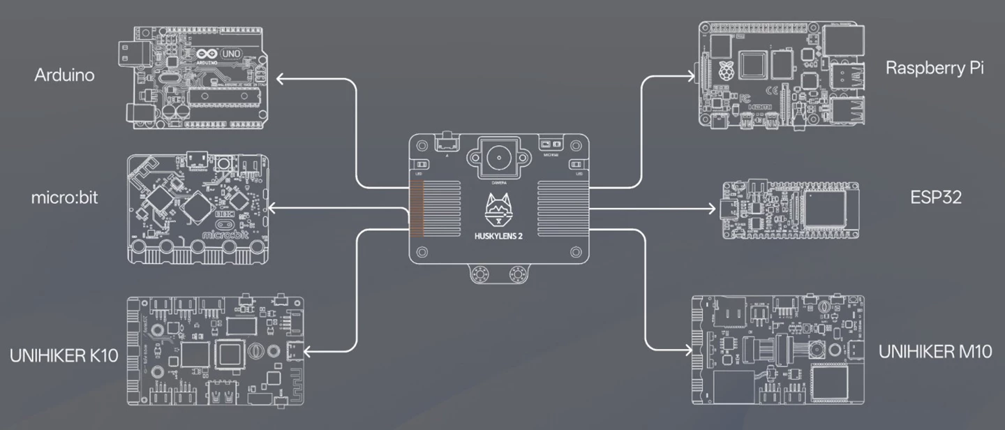 The HUSKYLENS 2 AI Vision YOLO Module features a versatile software stack designed for both beginners and advanced developers. Users can easily operate the device through its built-in touchscreen to access preloaded models, adjust detection thresholds, and fine-tune performance parameters. For advanced workflows, it supports the creation of custom datasets and training of YOLO-based models using frameworks such as ONNX, PyTorch, or TensorFlow, which can then be deployed directly through the onboard model deployment tool. The companion wiki provides detailed wiring diagrams, controller integration examples, and setup guides, along with support for the Model Context Protocol (MCP), enabling the module to transmit structured vision data to large language models for enhanced contextual processing and intelligent edge applications.