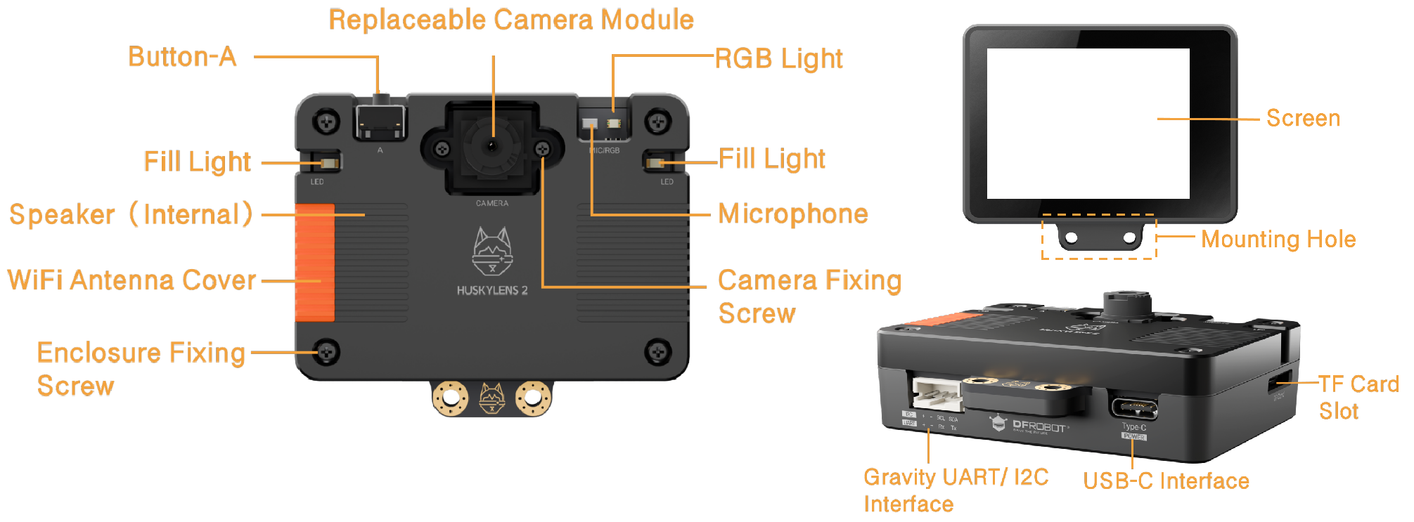 For connectivity, the HUSKYLENS 2 includes a USB-C port and Gravity-compatible I²C/UART interfaces for seamless integration with controllers such as Arduino, Raspberry Pi, ESP32, and micro:bit. An optional WiFi 6 module enables remote monitoring and data collection. With a compact 70 x 58 x 19 mm footprint and low power consumption of 1.5–3 W, it fits easily into embedded robotics, automation, and portable AI vision systems.