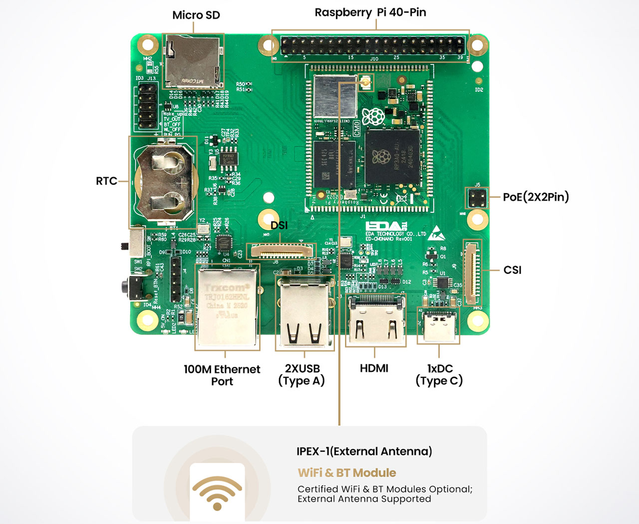 The board is easy to extend with the standard Raspberry Pi 40-pin GPIO header, MIPI DSI and CSI display and camera connectors, and optional Wi-Fi/Bluetooth support, which makes it a great option to prototype and deploy on a fast footing applications such as IoT gateway, automation control units, and custom embedded systems. Moreover, it compiles Raspberry Pi OS by default and accesses the rich software portfolio already known to developers all over the world.