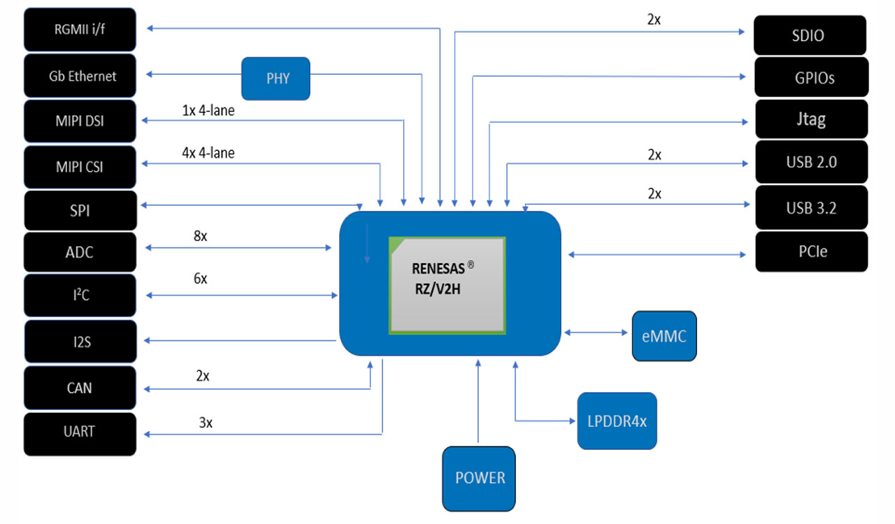 The core of the module is the RZ/V2H processor that consists of a combination of cores and accelerators. It is equipped with 4 ARM Cortex-A55 with its maximum frequency of 1.8 GHz, two ARM Cortex-R8 with a maximum frequency of 800 MHz and a Cortex-M33 with a maximum frequency of 200 MHz. Also, it has an artificial intelligence accelerator, known as DRP-AI3, with 8 TOPS in dense mode and 80 TOPS in sparse mode and Mali-G31 graphics processor (GE3D) as well as Mali-C55 instruction processor. This implies that the module is prepared to process real-time images, AI inference and intensive graphics functions.