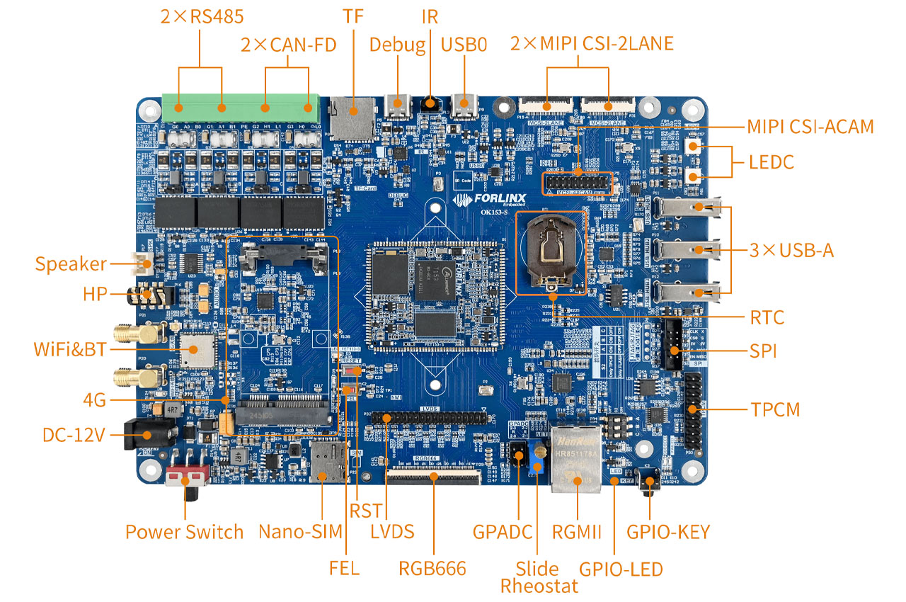 A companion carrier board, the OK153-S development board, expands the module’s usability by exposing an array of interfaces: RGB, LVDS, MIPI display support; dual MIPI-CSI camera inputs; microSD card, multiple USB 2.0 ports, RS-485, Mini-PCIe (for e.g. 4G modules) and WiFi/Bluetooth.