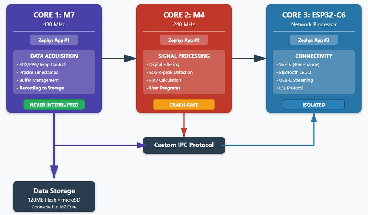 One of the strongest points of HealthyPi 6 is its edge computing power. A combination of an STM32H757 dual-core and an ESP32-C6 processor running Zephyr RTOS enables real-time signal filtering, artefact detection, HRV (heart rate variability) computation, and even machine-learning-based analysis directly on the device. This means you don’t need a tethered PC or cloud connection to process your data; just use the built-in 4-inch capacitive touchscreen to view real-time waveforms and metrics on the go.