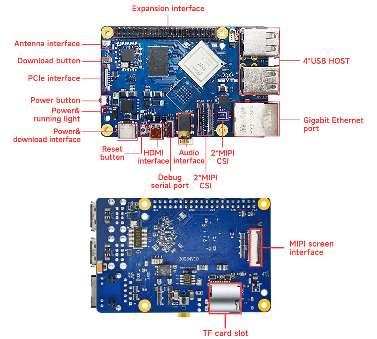 This Ebyte ECB32 SBC, powered by the Allwinner T527/A527 SoC, runs Linux-based systems such as Debian and Buildroot and supports frameworks like Qt and Python for development. It uses Linux kernel 5.15.147 and U-Boot 2018.07, with an available SDK that includes drivers, BSP, and firmware tools like PhoenixSuit and PhoenixCard. The board’s AI-capable variant (T527MN) supports TensorFlow, Keras, ONNX, and Caffe, expanding its use for edge AI applications. The mainline Linux kernel (v6.15+) now includes core SoC support, which is more likely to be compatible in the long term. Although HDMI and certain peripherals continue to use vendor kernels to be fully functional, continued community work is increasing in this area. In general, Ebyte can offer a solid Linux SDK, open documentation, and stable BSPs, which means that the ECB32 can be a good choice when an embedded, industrial, and IoT project will need the performance of the ARM-based platform and the versatility of Linux.