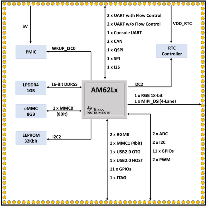 Connectivity on the AM62LX SoM is comprehensive. Dual 1 Gb RGMII Ethernet interfaces support networked applications, while a mix of peripherals, including USB 2.0 OTG and host ports, SD and QSPI interfaces, CAN, UART (with and without flow control), I2C, SPI, GPIOs, PWM, ADCs, and a debug UART, ensures flexibility in communicating with sensors, actuators, and displays. Display output options are provided via MIPI DSI and RGB interfaces, broadening the scope for embedded HMIs.