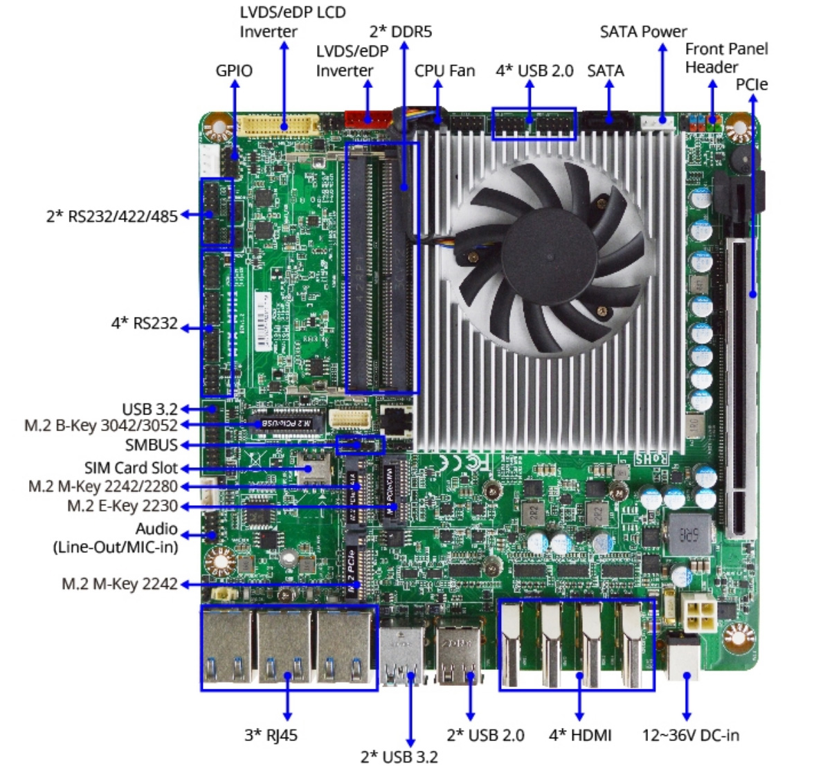Storage options include two M.2 M-Key slots (PCIe 4.0 NVMe/SATA), one SATA III connector with RAID 0/1, and a nano-SIM slot for cellular modules. Expansion is enabled through a PCIe Gen5 x8 slot, an M.2 E-Key for CNVi WiFi/Bluetooth, and an M.2 B-Key for 4G/5G modules. Networking is handled by triple 2.5GbE ports (Intel I226-LM and I226-V), while connectivity includes two USB 3.2 Gen2 and two USB 2.0 ports at the rear, plus internal headers for additional USB 3.2, USB 2.0, and multiple RS-232/422/485 serial ports. The board also provides GPIO, SMBus, I²C, a chassis intrusion header, and a system fan connector. Other features include Realtek audio with a 3W amplifier, optional TPM 2.0 security, UEFI BIOS, watchdog timer, Wake-on-LAN, and support for both AT and ATX power modes. The MTX-ARH1 takes 12–36V DC input via a DC jack, operates from -20°C to 60°C, and is certified to CE/FCC Class A and RoHS standards.