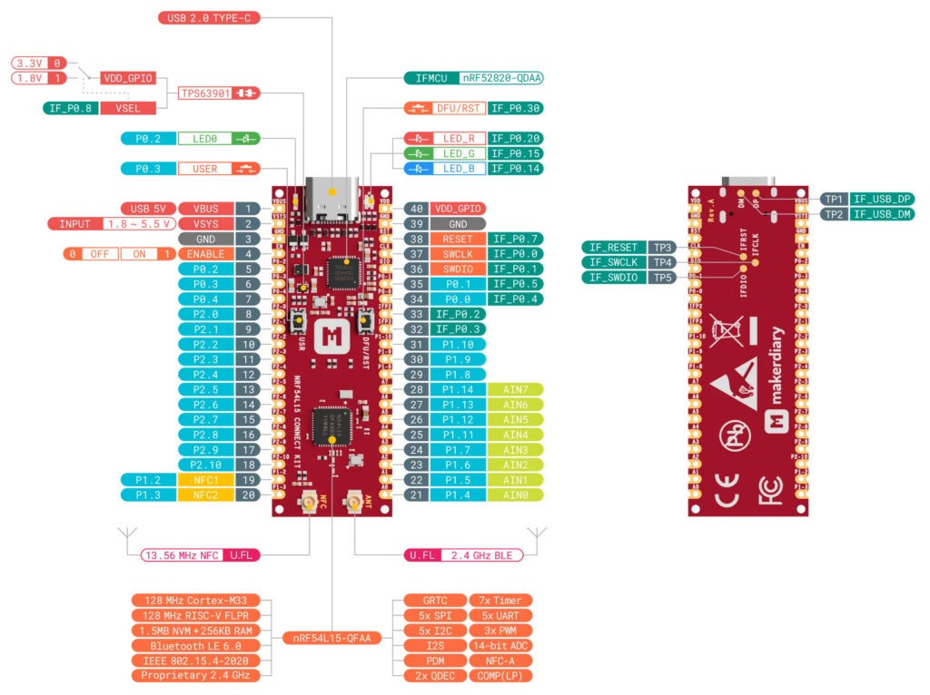 The board offers 31 GPIOs, 8 ADC pins, and multiple UART/I²C/SPI ports, as well as PDM/I²S audio interfaces and PWM support. Additional features of the board include USB-C connectivity, NFC-A tag, U.FL antenna connectors, and a TPS63901 buck-boost converter with selectable I/O voltage (1.8 V/3.3 V).