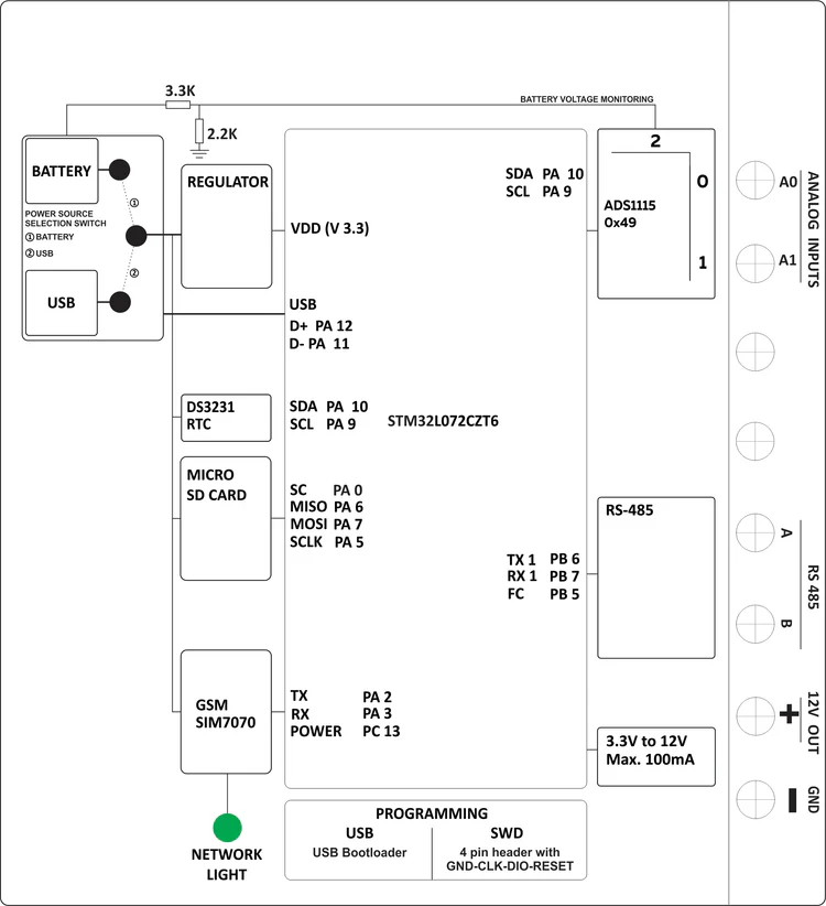 The logger works with the Arduino IDE, offering ready-to-use example sketches on GitHub for reading analog sensors and uploading data over cellular networks. Users can easily adjust logging intervals, sensor thresholds, and network behavior. Data can either be transmitted to cloud dashboards or saved locally on a microSD card, allowing flexible deployment in data acquisition, IoT monitoring, and remote sensing applications. More details available on the user guide page.