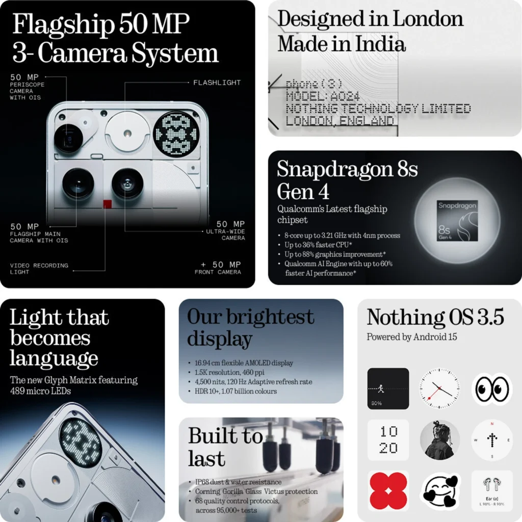 The Nothing Phone 3 comes in two configurations – 12 GB RAM with 256 GB storage or 16 GB RAM with 512 GB storage. It runs Android 15 and uses the Qualcomm Snapdragon 8s Gen 4 octa-core processor, reaching speeds up to 3.2 GHz for strong performance. An Adreno GPU handles graphics, while 5G support works with both Nano SIM and eSIM options. Its dust- and water-resistant build adds durability for daily use.