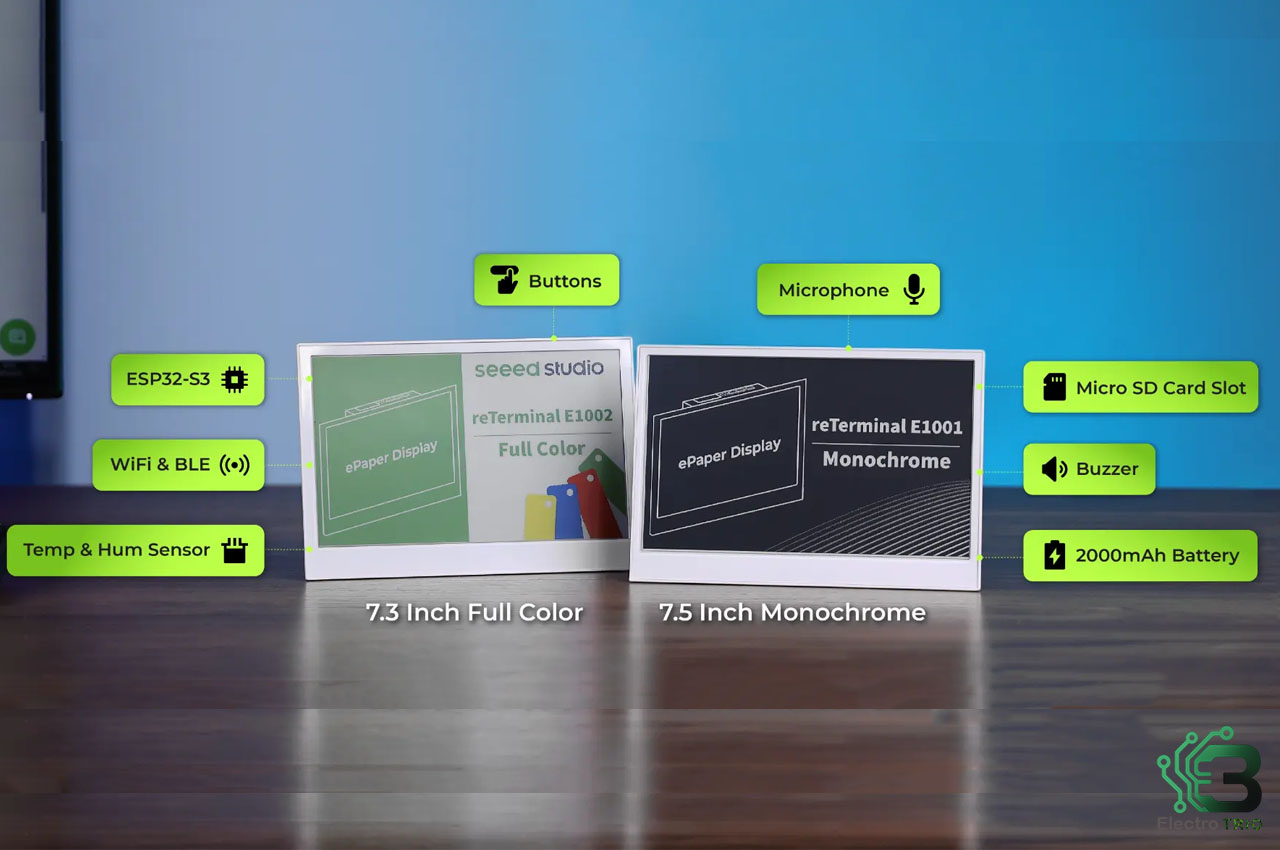 The most important distinction between the two is their displays. The reTerminal E1001 includes a 7.5-inch ePaper 4-level grayscale monochrome display at 800×480 resolution, suitable for text and simple graphics, and low-power signage. The reTerminal E1002 also has a display of 7.3-inch full-colour E Ink Spectra 6 (6-colour, 800×480 pixels), which can display richer visual content, like charts, photos, and multi-colour dashboards. The two displays use very little power when idle, drawing energy only during their refresh cycles.