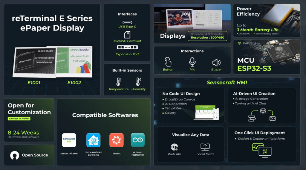On the software side, Seeed offers the SenseCraft HMI platform, a no-code tool for building dashboards and interactive interfaces. For developers, the reTerminal series also supports Arduino, ESP-IDF, and integration with platforms like Home Assistant and TRMNL, offering flexibility for both beginners and advanced makers.