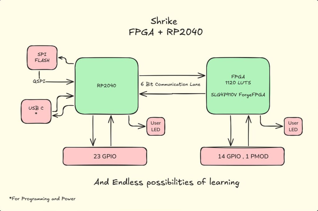 Shrike is a proposed open source development board, an Indian startup Vicharak and is designed around a Raspberry Pi RP2040 microcontroller with a Renesas ForgeFPGA to form a small yet powerful embedded and hardware development platform.
