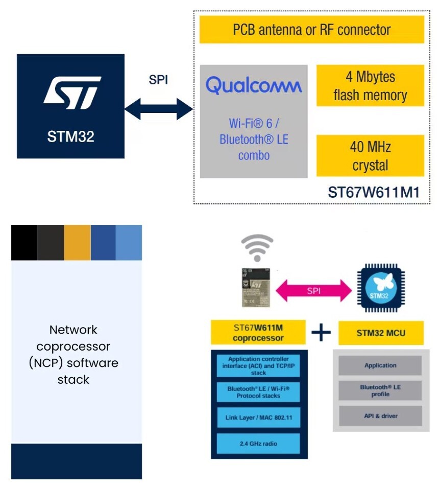 Software support is provided through the X-CUBE-ST67W61 package, which includes Wi-Fi and Bluetooth drivers along with ready-to-use examples. Development and debugging are supported via STM32CubeIDE, while STM32CubeMX is used for code generation and configuration. Host communication is handled over SPI. The X-CUBE-ST67W61 STM32Cube extension package enables STM32 microcontrollers to interface with the ST67W611M1 network co-processor, where the STM32 acts as the application host and the ST67W611M1 runs the full network stack in Network Co-Processor (NCP) mode.