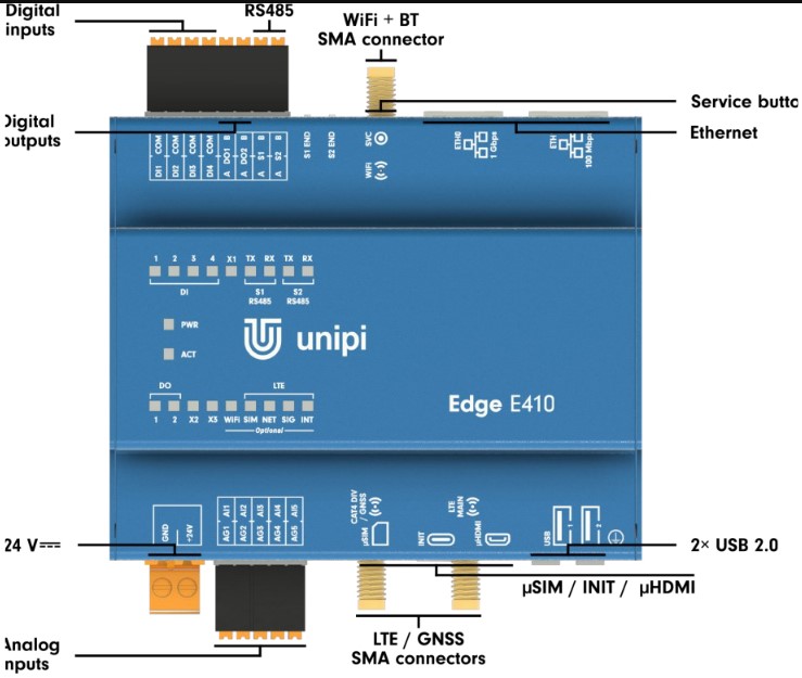 Unipi Edge E410 is designed on the platform of Raspberry Pi CM4 and has a processor with 4 cores: Cortex-A72 with a frequency of up to 1.5GHz. It offers LPDDR4 RAM ranging between 1GB to 8GB with 128Kb NVRAM and eMmc storage options of 8GB, 16GB or 32GB. In the video output, the controller offers a Micro HDMI port with up to 4Kp60. It has networking and wireless capabilities with dual Ethernet ports (1 Gigabit and 1 Fast Ethernet), dual band Wi-Fi, Bluetooth Low Energy and a variety of LTE modules, including Quectel Cat 1, Cat 4 and Cat 1 with GNSS and support of GPS, GLONASS, BeiDou, Galileo, and QZSS. There is also a Micro SIM slot, RP- SMA antenna connectors and two USB 2.0 type-A ports to expand the peripheral.