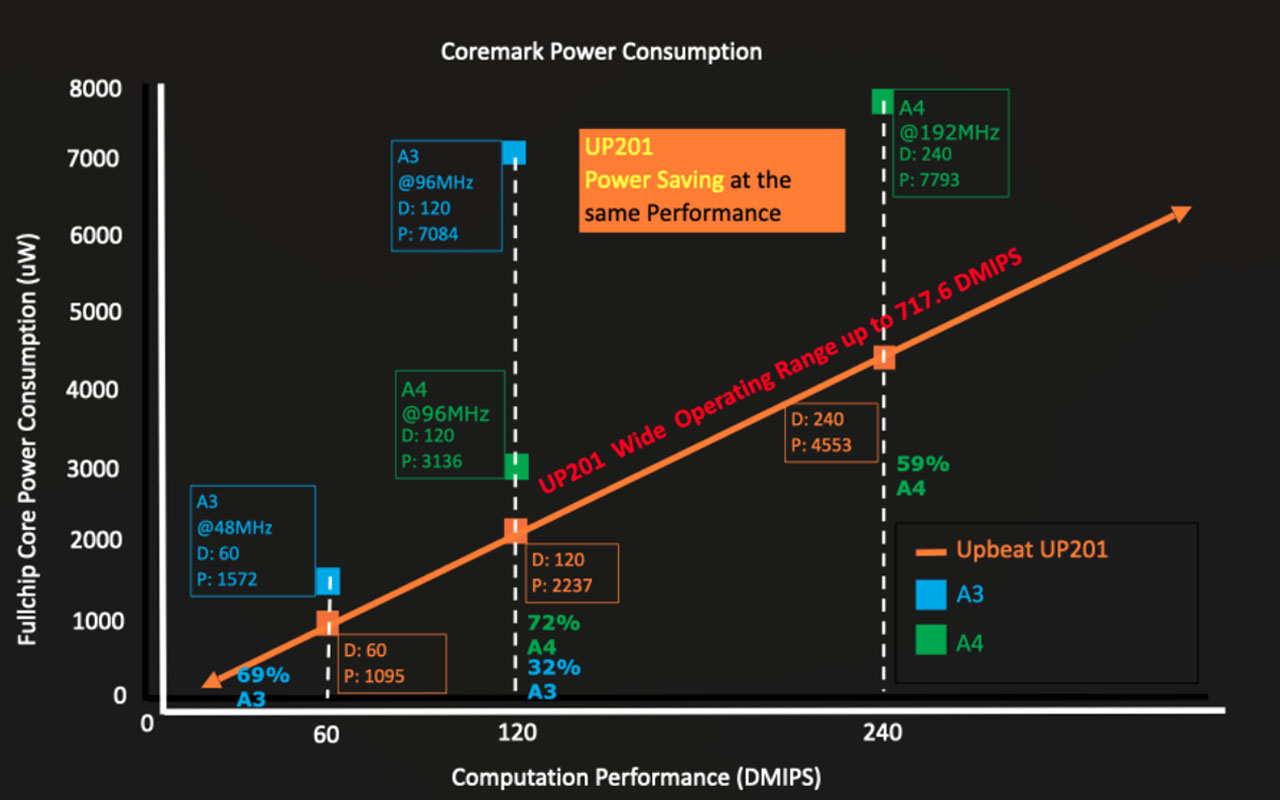 The two variants, UP201 and UP301, share the core architecture but differ in target use cases. UP201 is made to fit very small sizes of endurance battery-powered devices (3 mm WLCSP x 3 mm) with ultra-low footprint and can be used in wearables like smart watches or hearables. UP301 is able to support the richest peripherals, vision, and greater compute loads: 5 mm x 5 mm FCCSP, which puts it more appropriately in higher-end applications such as AR glasses, battery-operated robotics, or industrial AI.