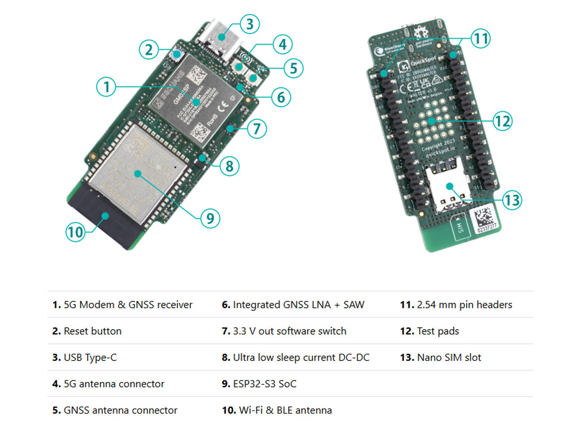 The most interesting peculiarity of Walter is that it is certified to be used globally: CE, FCC, IC, RCM and UKCA. That means it’s ready to go for commercial IoT projects without you having to wait for major region-specific approvals. The module is designed and built in the EU, which adds to its appeal for those looking for long-term availability and quality.